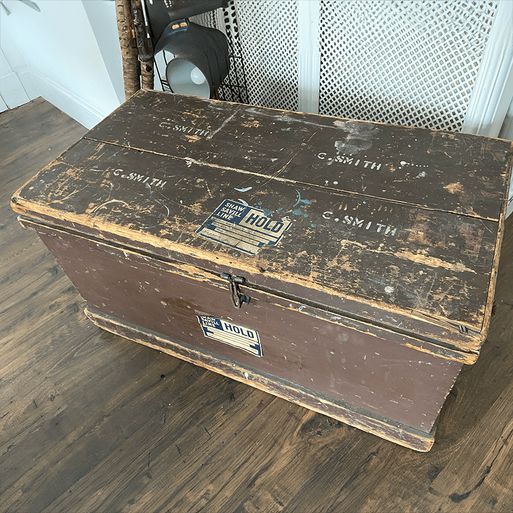 Victorian shipping trunk with original shipping labels from Southampton and Saville Shaw Lime.
